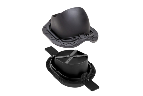 MUOTOKATE 2K проходной элемент для металлочерепицы с профилем Monterrey (ширина волны ≈ 183,3 мм, длина профиля min 350 мм, высота профиля ≈ 39 мм). В комплект входит двухкомпонентный 2K-уплотнитель гидрозатвора, гарантирующий полную герметичность прохода через гидрозащитную пленку.